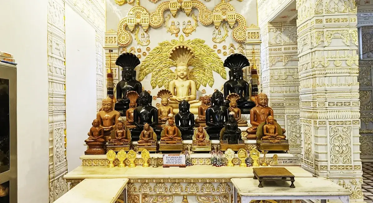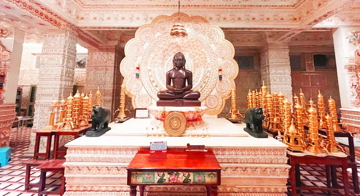 The temple’s architecture resembles a majestic fortress with multiple spires and domes. This fortress-like appearance adds to the temple’s grandeur. Among its most significant features is the sanctum (garbhagriha) dedicated to the revered Jain Goddess Padmavati. This sanctum, constructed in 1886 by Bholanath Singhai, is adorned with intricate glasswork, showcasing the temple’s exquisite craftsmanship.