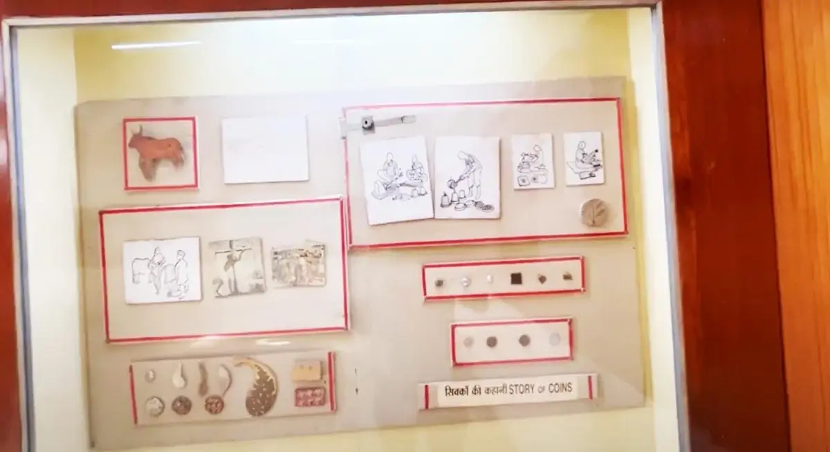 Exhibits include punch-marked coins, Kushan coins, Gupta coins, Mughal coins, and Holkar dynasty coins.