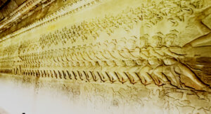 - दीवारों पर की गई नक्काशी (Bas-Reliefs) में रामायण, महाभारत और खमेर साम्राज्य के युद्ध दृश्यों का सुंदर चित्रण है।